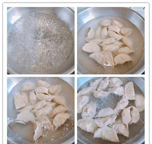 10、饺子都包好之后就可以开始煮了,水开之后加一点食盐和食用油防粘,下入饺子,轻轻搅动避免粘锅,水开之后加入半碗冷水,水再次微开之后继续加冷水,一共加3次冷水,煮到饺子鼓起,飘在水面就煮熟了;
