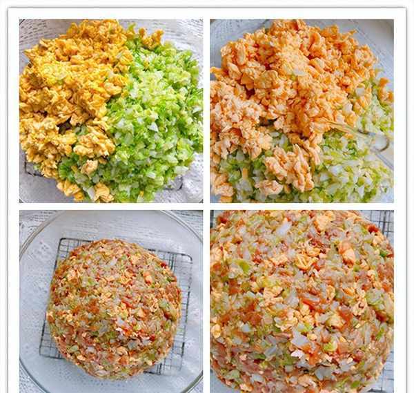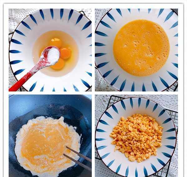 3、鸡蛋打在碗中,加一勺食盐和少许料酒,搅打成鸡蛋液,锅烧热,加入适量的食用油,下入鸡蛋液,用筷子不停地搅拌,翻炒成鸡蛋碎,出锅晾凉备用;