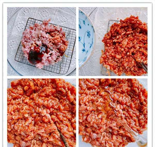 7、猪肉放在料理机中搅成肉泥,开始调味,加食盐、生抽、老抽、蚝油、白糖,搅拌均匀,猪肉的味道稍微调重一点,把白菜的味道算进去,味道调好之后开始“打水”,往肉馅中分次加入150g葱姜蒜水,每加一次都要充分搅拌均匀之后再加下一次,完全搅拌均匀之后的肉馅是水润润的,最后加入适量的食用油,锁住肉馅中的水分;