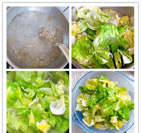 5、锅中烧水,水开之后加入1勺食盐和适量的食用油,食盐和食用油能很好避免牛心菜变色,牛心菜比较多,我是分批下入锅中的,一次放的太多,容易导致菜的生熟度不一致,每一次放入适量的牛心菜,用筷子把菜都压到水里,等菜变色,马上出锅,不用等水再次煮开,只要烫到菜变色就马上出锅,这样焯水的好处是既能杀出水分,菜也不会太熟,保证了牛心菜的脆度,出锅之后放在冷水中过凉,最好是放在流动的清水下冲凉,降温更快;