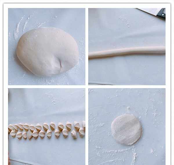 9、饧好的面团放在案板上,撒上少许粉料,把面团搓成长条,切成大小均匀的面剂子,取一个面剂子,将它压扁,压扁之后擀成圆形的面皮,取一个面皮,放上适量的馅料,包成饺子形状;