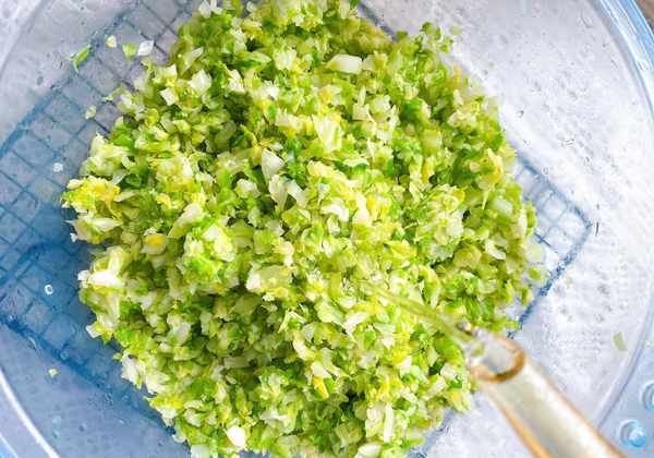 6、牛菜心都焯好水之后,挤干水分,将它剁碎,剁碎之后再次挤干水分,放在一个大盆中,加入适量的食用油,搅拌均匀,加食用油能避免牛心菜再次出水,菜里面就不加食盐或者生抽调味了,一是为了避免出水,而是鸡蛋和肉馅都是要调味的,咸度在这两种材料中调酒可以;
