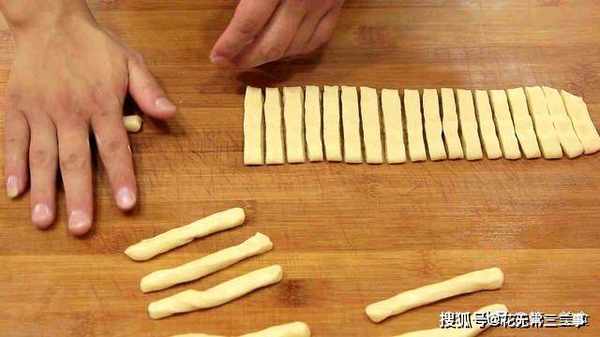 3.十分钟以后,在案板上抹上一层植物油,把饧好的面团取出来,不用揉、直接搓成长条,揉面起筋的话,做出来的芝麻条容易回缩,用手掌摁扁擀成1厘米左右的厚片,然后用刀划成一根一根的宽条,再把宽条搓圆一点。