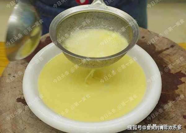 用密漏过滤一下,筛出里面的气泡以及没有打碎的蛋清。