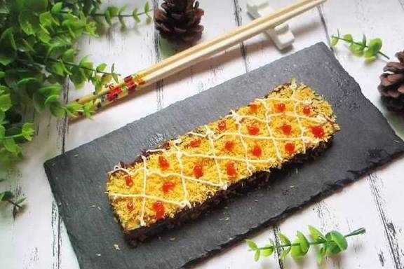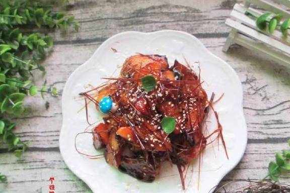 8、捞出装盘,炸好的茄子特别软糯,一定要小心装盘,然后用沙拉酱和番茄酱进行点缀