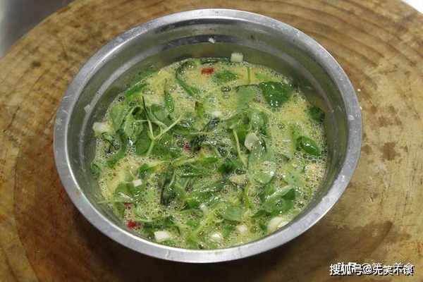 准备一个小盆,打入四个鸡蛋,红椒一片,去籽后切成小粒,大葱白一段,破开切成葱花,和鸡蛋放在一起,加入食盐2克,胡椒粉2克,滴入少许水淀粉,水淀粉能使鸡蛋更有韧性不易破碎,放入洗净的荆菜,搅拌均匀备用。