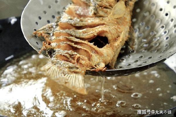 ,锅内烧油,油面有少量青烟冒出,掂起鲤鱼的尾部慢慢把鲤鱼下入锅内。不断地用热油淋在露出油面的部分。
