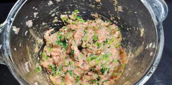 第四步:将焯好的菊花挤干,然后磨碎加入肉馅。加入3汤匙油(蘑菇油或食用油更好)并充分混合以覆盖馄饨。