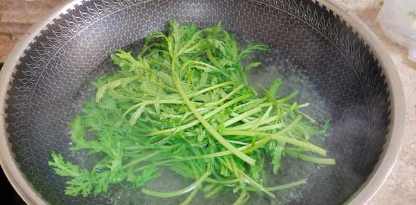 第一步:买一束菊花只要3块钱,剩下的我们只取一半留着炒,菊花用清水洗净,然后放入锅中用开水焯1分钟.,可降低菊花的异味。如果您不介意气味,可以跳过漂白步骤。