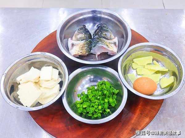 一个鱼头对半劈开,去除牙齿和鱼鳃;一块嫩豆腐切成豆腐片;生姜切成片;小葱切成葱花;一个鸡蛋备用。