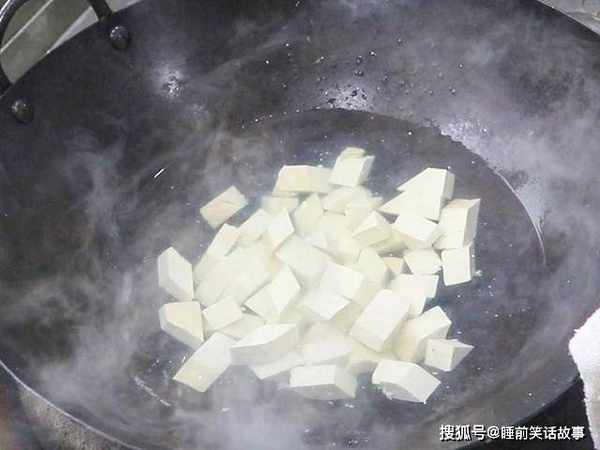 锅内烧水,把豆腐凉水放入锅中煮1分钟去除豆腥味,水烧开以后把豆腐倒出来控水备用。