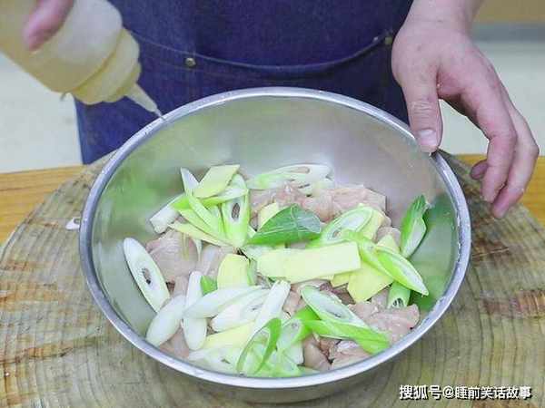 鸡胸肉去除鸡皮和筋膜,把鸡肉切成小块,生姜切成片;大葱切成段和鸡肉放在一起,淋入一些料酒去腥,抓拌均匀腌制5分钟。