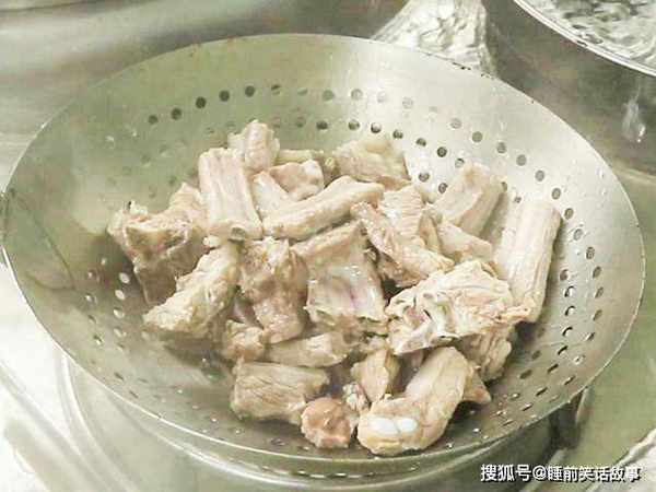 锅内烧水淋入料酒去腥,排骨冷水下锅煮出血沫,大约煮2分钟倒出排骨,清水冲洗干净 沥水备用。