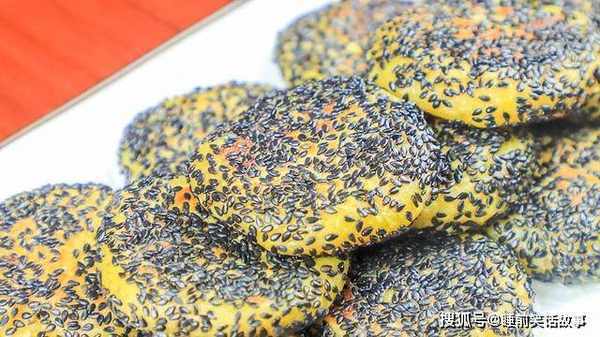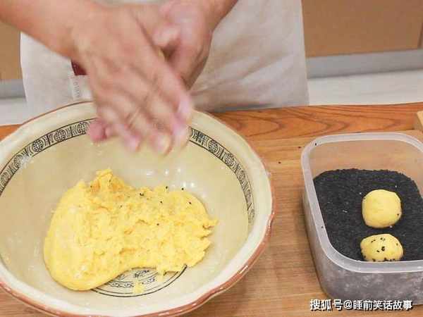 取适量面团在手心处团成圆球,放入装有黑芝麻的盒中,让其均匀裹上黑芝麻,然后把圆球压扁,红薯饼的生坯就做好了。