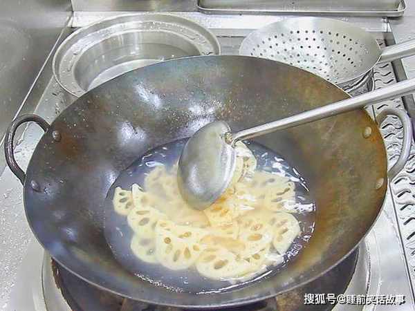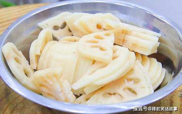 锅内烧水,温水把藕片下锅,水开后焯水2分钟,等到藕片焯熟后倒出控水备用。