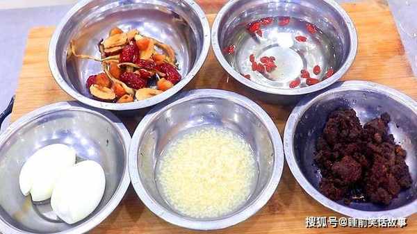 适量的当归、几粒桂圆去核;一小把红枣用清水洗干净;枸杞一小把用清水泡上;准备适量的酒糟;适量的红糖。