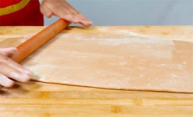 3、面团醒好后,在案板上撒些干面粉,将面团放在案板上揉搓排气,然后用擀面杖擀成厚薄均匀的长方形面片.