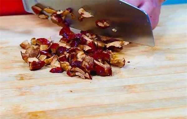 2、准备几个红枣,用清水泡软,用刀切成条状,去掉枣核,再切成红枣丁,盛入碗中待用。
