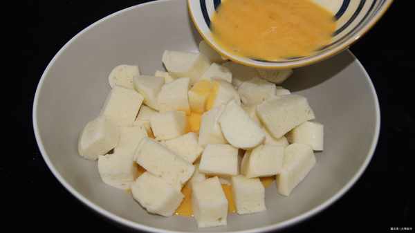 将打好的蛋液倒入馒头中,用筷子搅拌均匀。让馒头充分沾满蛋液。方便以后煎馒头。