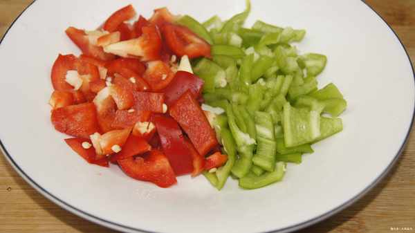 先把凉透的馒头切成小块,再横切,再竖切,大概两个手指头那么大。接下来打三个鸡蛋并搅拌鸡蛋直至完全混合。接下来,用十字刀切一个洋葱,把洋葱分成小方块,最后用刀把洋葱切碎,准备好切碎的洋葱放在一个小碗里。另取青椒和红椒,切成细条。最后一片火腿肠。大葱切段准备一些,辣椒粉、孜然粉、椒盐粉也是少不了的。