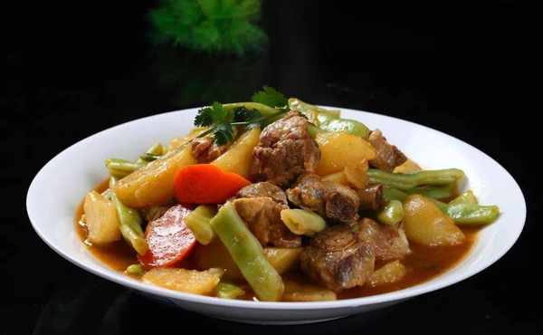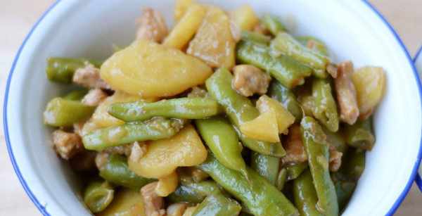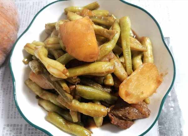 配料表:四季豆、排骨、西瓜酱、土豆、大葱、姜、干红辣椒、青椒、酱油、花椒、盐、蚝油、料酒