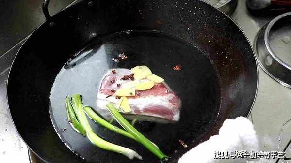 3.下面我们开始煮五花肉,锅中烧水,冷水放入洗净的五花肉,五花肉冷水下锅,更易煮出血水,放入姜片,撒入几粒花椒,一粒八角,放入葱段,加入料酒10克去腥,盖上盖子把水烧开之后,转小火煮20分钟。