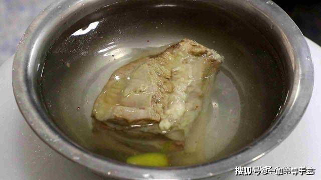 6.20分钟以后,五花肉已经煮熟煮透,把五花肉捞出放入清水中冷却。