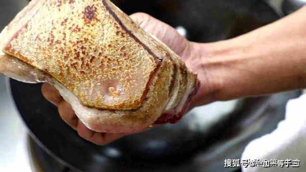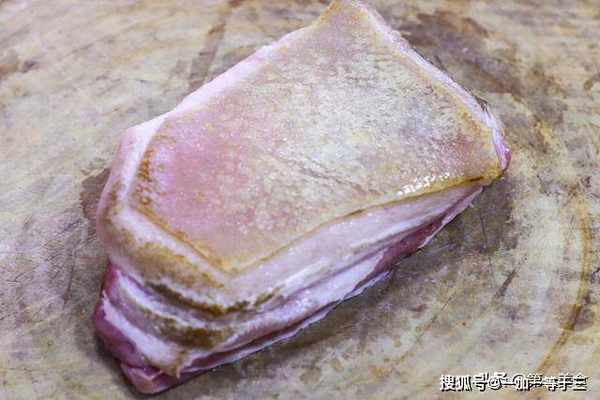 1.首先我们准备五花肉一块,放入烧热的锅中,使劲摁压、擦动肉块,这样能把猪皮上的杂质和残留的猪毛去除干净,达到去腥去异味的效果。