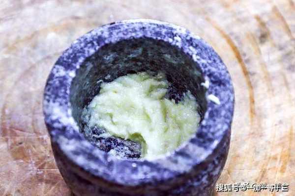 4.煮肉的时间,我们准备酱汁,石臼中加入食盐2克,大蒜一小把,边捣 边放大蒜,把大蒜碾成蒜泥,充分释放香味,没有石臼的也可以用刀剁,剁的越细越好,越细口感越香,而且不辣口。