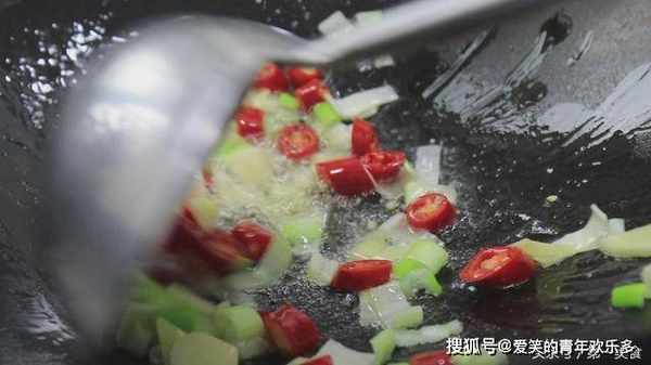 锅内烧油, 倒入葱姜蒜和小米椒快速翻炒。