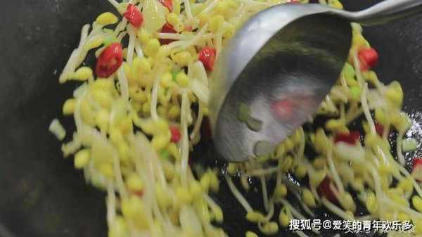 翻炒出香味以后倒入黄豆芽快速翻炒。翻炒一分钟左右,炒至黄豆芽断生。