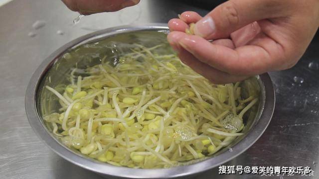 黄豆芽300克用清水浸泡,想快速的把豆皮泡掉,漂浮起来就在水里放点食盐,