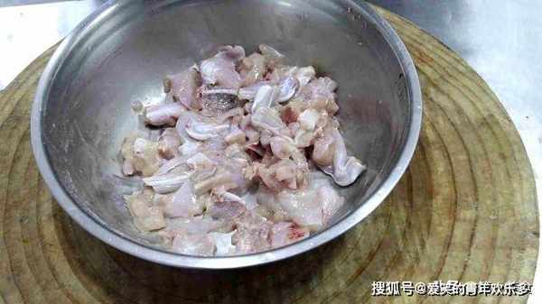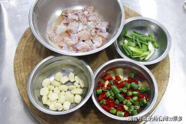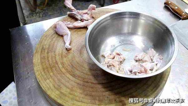 1.首先我们准备一下食材,人工饲养的牛蛙两只,先把头切掉剥去外皮,再把内脏去除干净切掉脚趾,放入清水中把血水清洗干净以后捞出,剁成大小均匀的小块备用。