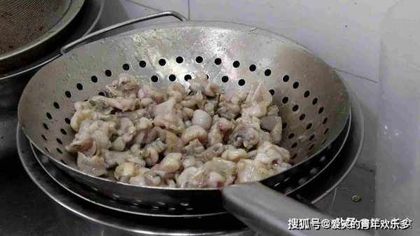 4.食材准备好以后,我们开始烹饪,锅内加入适量的植物油,油温六成热,油面冒青烟时把腌好的牛蛙倒入锅中,快速油炸10秒钟捞出控油,经过油炸的牛蛙肉质更紧实。