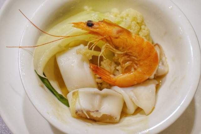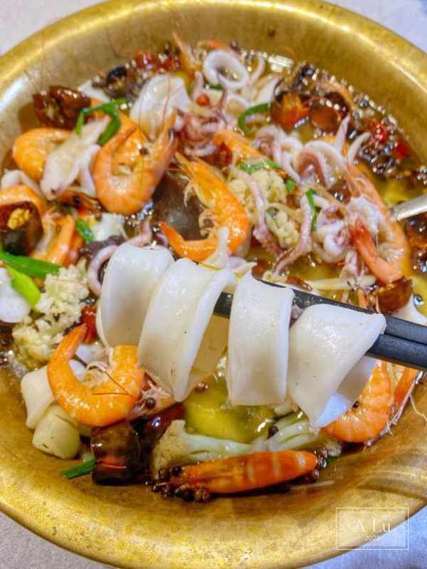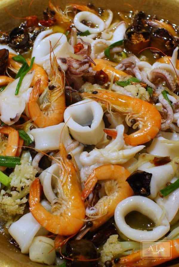 每回来都是冲着这口“金盆”装置的水煮小鱿鱼而来,小鱿鱼一如既往的鲜脆,习惯性的加点上一份鲜虾,海鲜池现捞的鲜虾就是鲜甜,常以花菜和黑木耳等时令素菜为配菜,吸收了鱿鱼和虾的甜度的配菜很是入味。汤清味美,是能直接喝的,香而不辣喉,是适口的闽南式麻辣,每次都被扫的精光。