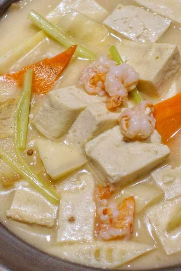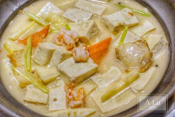 咸肉鲜笋豆腐煲,腌制的咸肉释放着咸鲜,和当季的鲜笋,还用虾仁提鲜,豆腐带着柴火香,饱吸鲜味,颇有几分腌笃鲜的意思,看着朴素滋味却出奇的好。