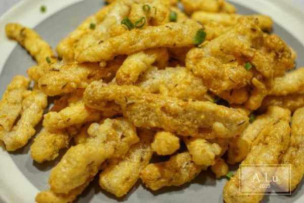 打CALL下咸蛋黄焗双菇,菇类切成细条状炸制后再经咸蛋黄炒制,表皮的脆浆上完美的裹满咸蛋黄,浓郁的蛋黄香气,菌类吃出肉感,确实美味。