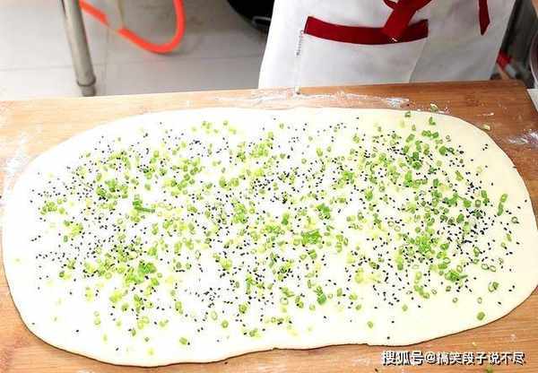 4.用擀面杖把面团擀成长方形的薄片,再用小刷子在面皮上面均匀地刷一层植物油,抓一把食盐均匀地撒上食盐,同样的方法再均匀地撒上黑芝麻,把小葱花也撒在面皮上面。