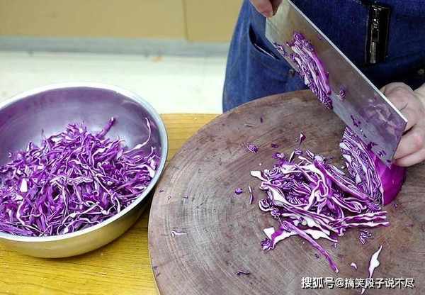 1.紫甘蓝用半个就够了,剔除中间的硬根切成细丝,把切好的紫甘蓝,多冲洗几遍充分去除表面的浮色,这样拌出来既不会发黑、口感也更加清脆。