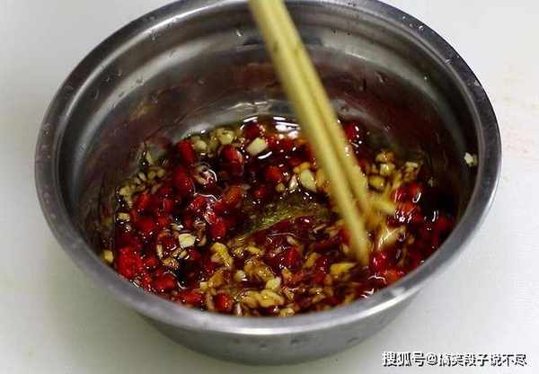5.准备大蒜几粒,拍散剁成蒜蓉,红椒一片切成颗粒,和蒜放在一起,加入食盐2克,味精1克,生抽10克,陈醋5克,明油5克,香油5克,把所有调料搅拌均匀。