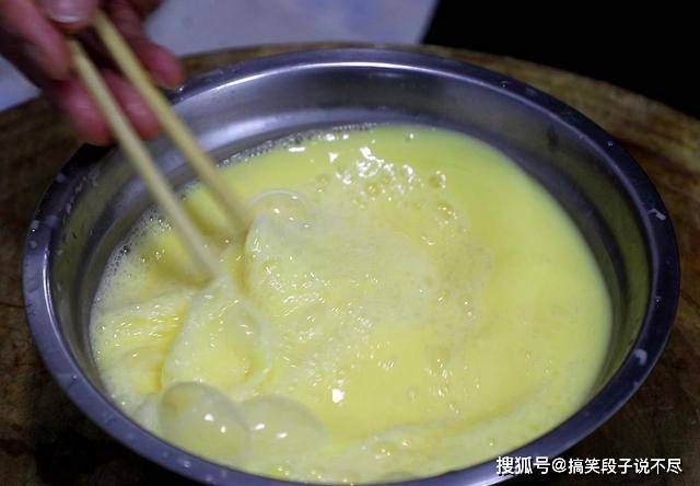 2.盆中打入5个鸡蛋,加入适量凉开水和少许淀粉,凉开水氧气含量极少能有效避免气孔产生,而且加水 鸡蛋口感更嫩,淀粉能增加鸡蛋的韧性更易成型,搅拌打散成蛋液,再加入食盐2克入底味,搅拌均匀。
