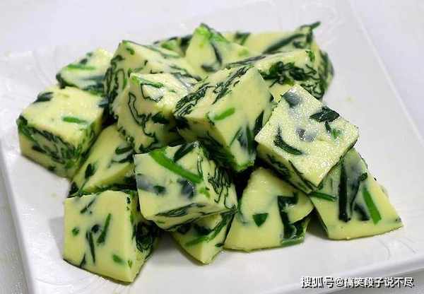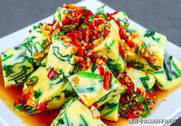 6.10分钟以后把蛋羹取出,倒扣在案板上切成均匀的方块,摆放在盘中,浇上准备好的料汁即可。