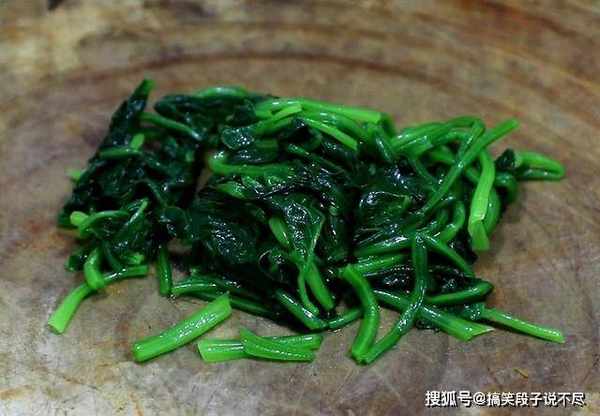 1.准备洗净的菠菜一把,锅内烧水,放入少许食盐和植物油,食盐入底味,植物油保持菠菜的翠绿营养不流失,待水烧开,把洗净的菠菜下锅,焯水20秒钟,菠菜变软后倒出用清水冲凉, 把菠菜焯水切成段备用。