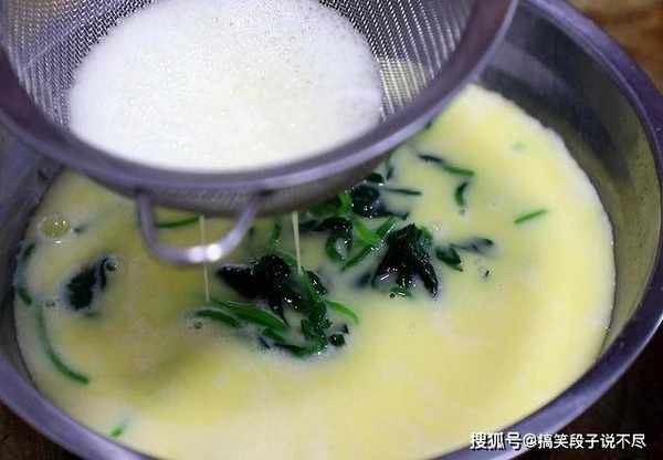 3.把准备好的蛋液倒入菠菜中,倒的时候把蛋液过一下滤网,筛出气泡和没有打碎的蛋清,使蒸出的蛋羹更加平整嫩滑。