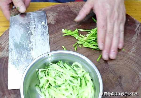 3.黄瓜半根切成细丝,香菜只用杆切成段,青椒切成丝,这些配菜主要用来搭配颜色,可以随便选自己喜欢的。