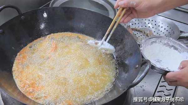 我们把大虾过油炸一下,锅内烧油,油温五成热时,放入大虾,下入大虾之前先裹匀玉米淀粉,裹上淀粉可以使大虾炸得更加酥脆。