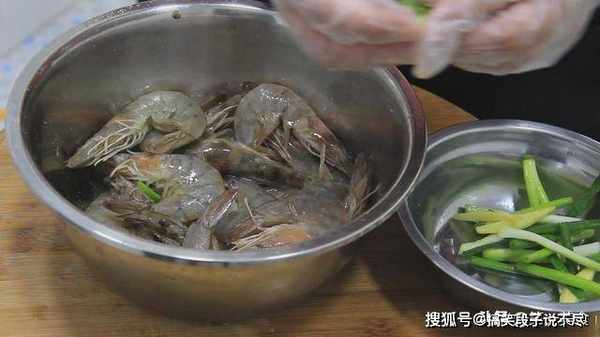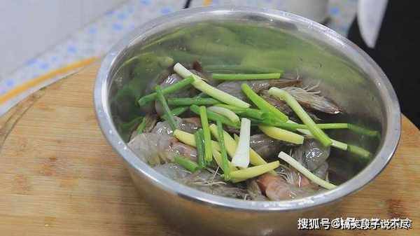 把大虾从水中捞出,倒入小葱段和生姜片,放入