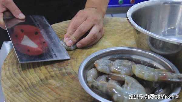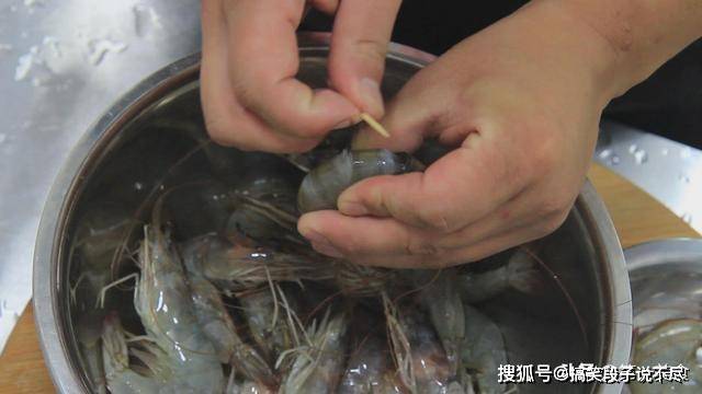 然后剪去虾须和虾枪,从背部片开,倒入清水再次浸泡清洗。