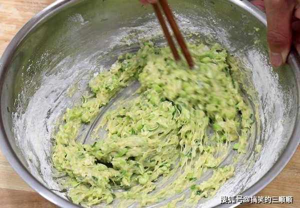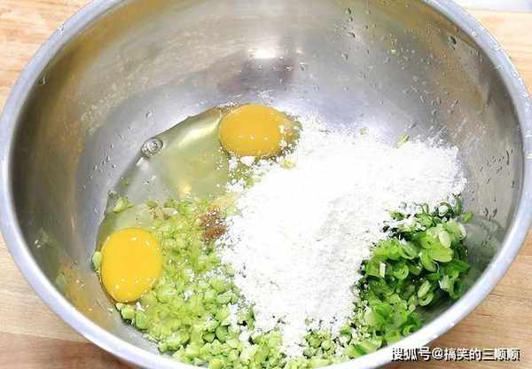 1.准备豌豆200克,剁成碎粒放在盆中。小葱一根,切成葱花、姜末,和豌豆放在一起。加入香油5克,食盐2克,五香粉1克,打入两个鸡蛋,放入面粉30克。