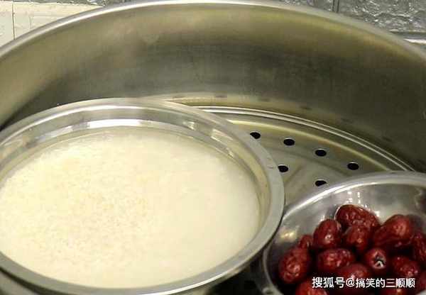 2.往江米盆中倒入适量的水,水量没过一指即可,把红枣和江米放入蒸锅中,盖上锅盖,中火蒸制半个小时即可,把江米蒸熟。